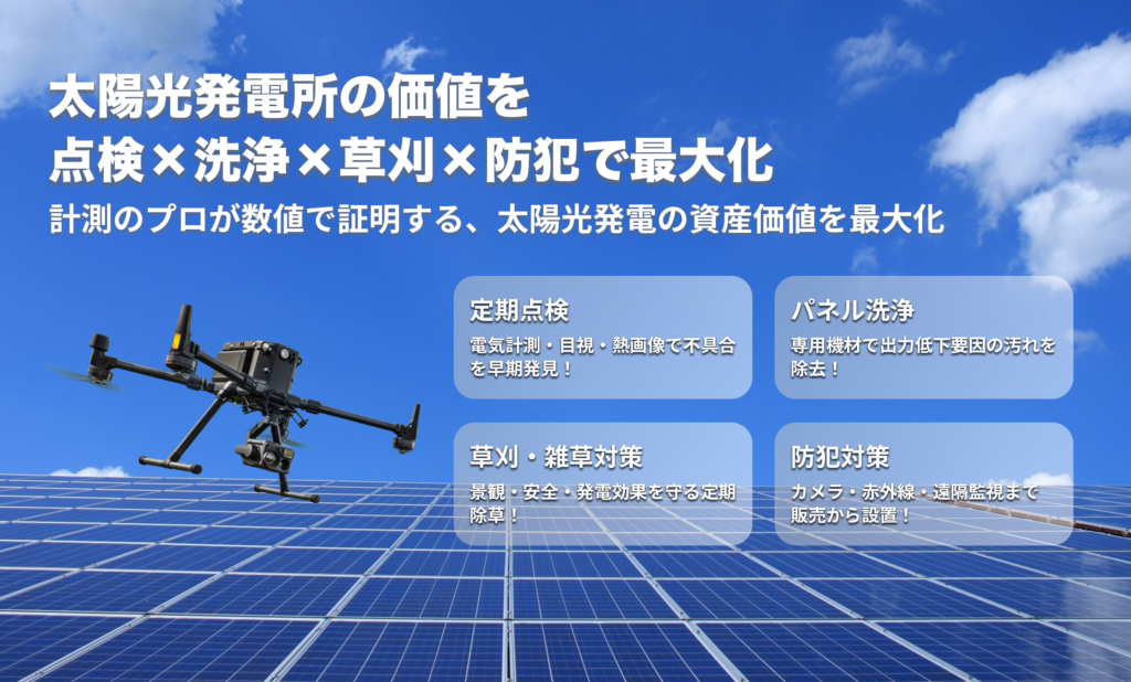 本事業では、太陽光発電所の点検業務をはじめ、パネル洗浄、除草作業、防犯設備の販売・設置まで幅広く対応いたします。